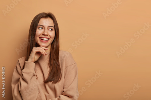 Pleasant looking cheerful brunette woman looks aside with charming smile, keeps hand under chin, wears casual sweatshirt, poses against beige background, remembers hilarious event, has joyful look