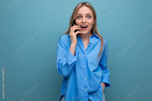 pleasantly surprised cute blonde woman chatting on the phone on a blue bright background