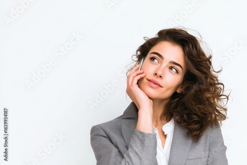 Please hold briefly while a lovely employee chats on her phone against a white background with space for text