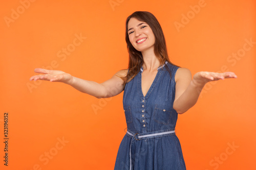 Please, take for free! Generous friendly pretty brunette woman in denim dress welcoming with wide open arms and smiling kindly, happy to embrace you. indoor studio shot isolated on orange background