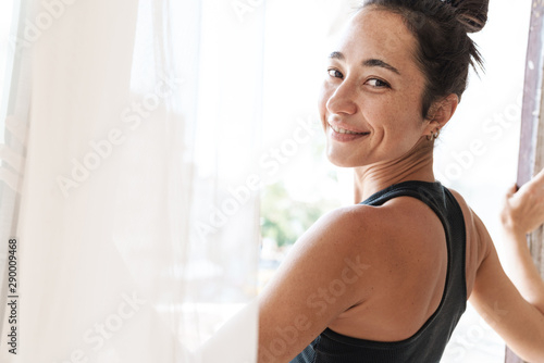 Pleased beautiful woman indoors at home in a bedroom standing near curtains.