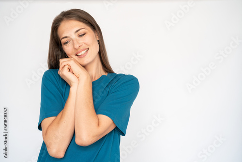 Pleased Caucasian woman leaning on hands. Portrait of happy young female model with brown hair in blue T-shirt looking down, smiling, reacting to something cute. Kindness, memory concept