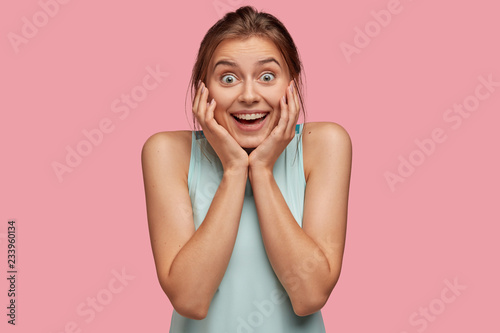 Pleased cheerful excited young woman smiles broadly, keeps hands on cheeks, satisfied with good news, models against pink background, cant believe in something wonderful, wears casual clothing