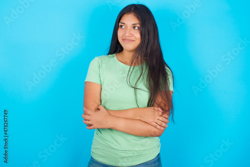Pleased Young hispanic girl wearing green T-shirt over blue background keeps hands crossed over chest looks happily aside