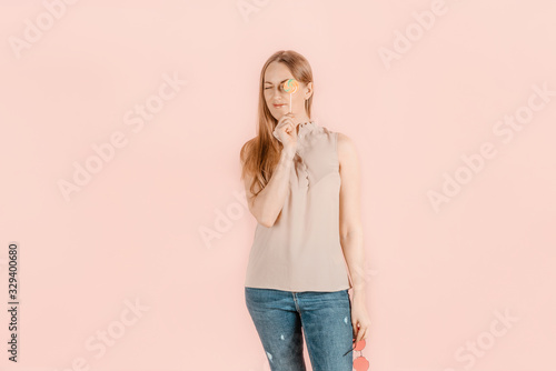 Pleasure and sweetness. Girl holds in hands a colored lollipop, pink background. Fun and holiday.