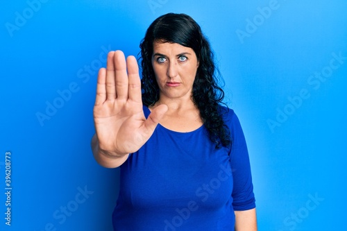 Plus size brunette woman wearing casual blue shirt doing stop sing with palm of the hand. warning expression with negative and serious gesture on the face.