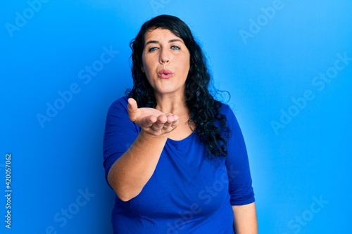Plus size brunette woman wearing casual blue shirt looking at the camera blowing a kiss with hand on air being lovely and sexy. love expression.