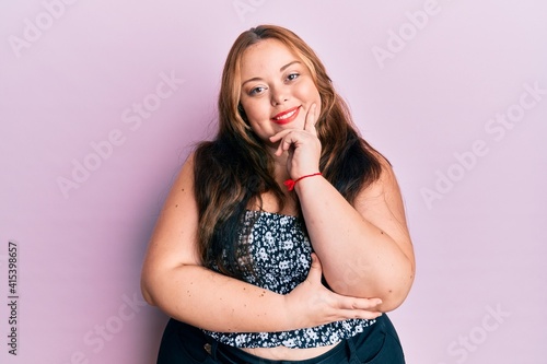 Plus size caucasian young woman wearing casual clothes smiling looking confident at the camera with crossed arms and hand on chin. thinking positive.