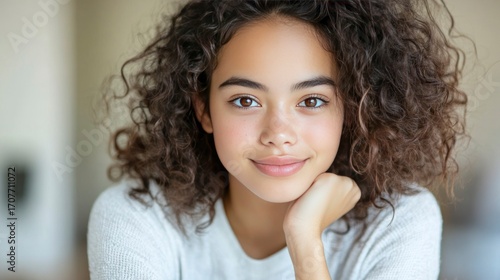 Plus-size Asian teenager smiling and resting chin on hand indoors