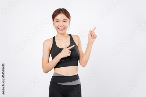 Point to the sky with a confident smile fit woman shows her points again, standing strong in black sportswear and embracing her fitness journey with grace and energy. isolated studio white background