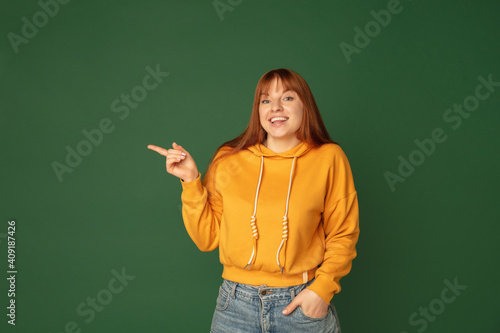 Pointing. Caucasian woman's portrait isolated on green studio background with copyspace. Beautiful female model in yellow sweatshirt. Concept of human emotions, facial expression, sales, ad, fashion.