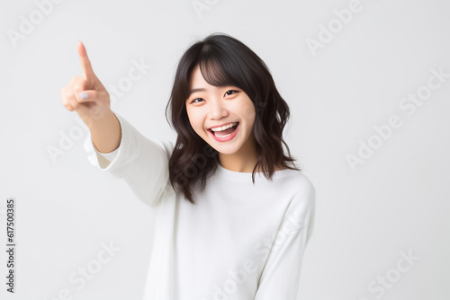 Pointing finger of an Asian girl highlights vacant space on a white background, making it a prime choice for a promotional advertising banner. Generative AI.