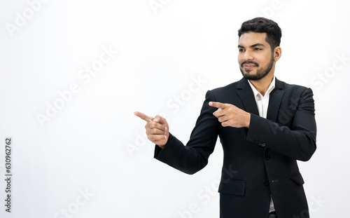 Pointing finger to blank space. Happy Young asian businessman on isolated white background. Handsome businessman in office suit uniform.