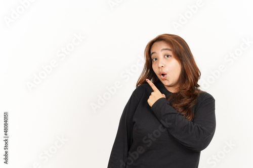 Pointing product on the side Of Beautiful Asian Woman Wearing Black Shirt Isolated On White