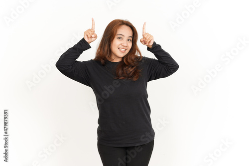 Pointing up Product or Copy Space Of Beautiful Asian Woman Wearing Black Shirt Isolated On White