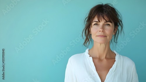Poised and Serene Middle Aged French Woman Wearing Breezy White Linen Blouse Posing Against Plain Blue Studio Background with Ample Copy Space Above