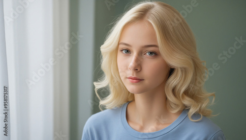 Portait visage jeune fille blonde platine brushing coiffeur mannequin modèle beauté.