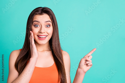 Portrairt astonished funny funky charming lady advertise recommend select demonstrate indicate news promo hold hand impressed unbelievable unexpected wow omg orange singlet isolated teal background