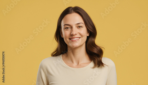 Portrait adulte femme employée souriante fond jaune entretien embauche.