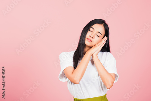 Portrait Asian beautiful young woman pretended emotions sleeping tired eyes closed dreaming with hands together near face, studio shot on pink background, with copy space, insomnia concept