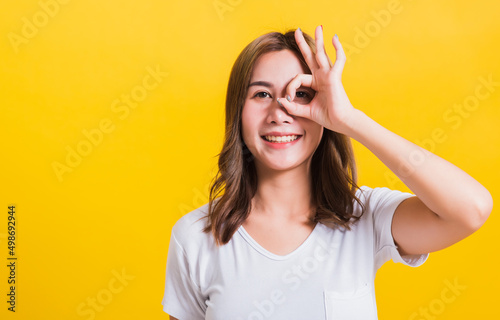 Portrait Asian Thai beautiful young woman standing, She made finger OK symbol sign to agree near two eyes and looking at camera, shoot photo in studio on yellow background, There was copy space