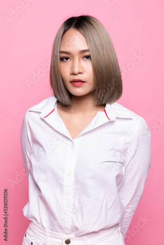 Portrait attractive asian woman feeling happy in front of a bright pink background.