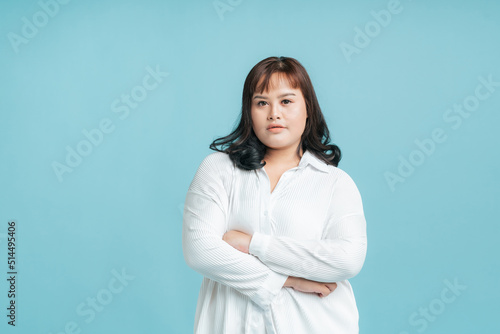 Portrait beautiful confidence Asian woman plus size cross arms on isolate light blue studio background. Young female chubby confident concept.