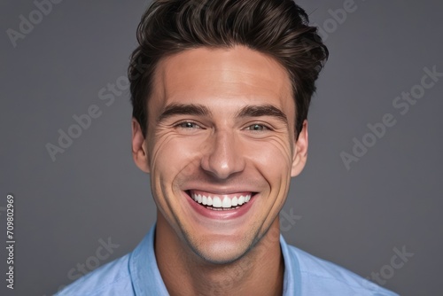Portrait beautiful young model man with white teeth smile on grey background. Generative AI