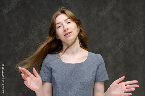Portrait below the chest of a young pretty brunette girl woman with beautiful long hair on a gray background in a gray dress. He talks, smiles, shows his hands with emotions in various poses.