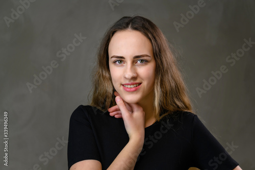 Portrait Caucasian happiness girl in a black dress with long hair and a beautiful smile with straight teeth on a gray background.