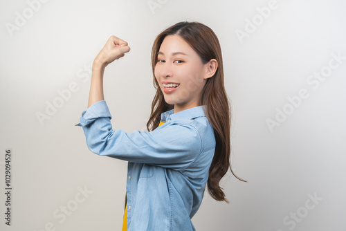 Portrait cheerful beautiful, happy asian young woman, girl gesture confident, proud showing strong powerful body muscle, healthy strength arms and fists, expressing success, isolated on background.
