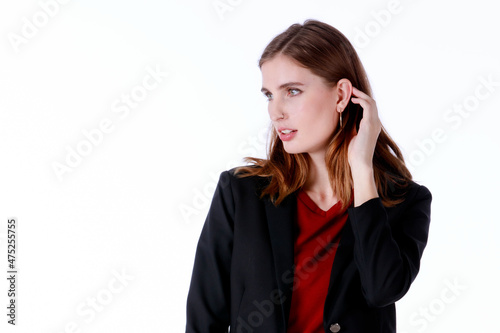 Portrait closeup isolated studio shot of Caucasian confident smart professional successful long hair female businesswoman in formal working suit standing smiling on white background