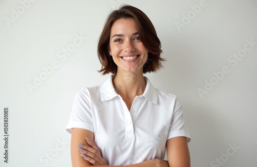 Portrait content woman in 30s. Classy polo shirt against white background. Smiling female, arms crossed. Business attire concept. Pro look, casual style. Light, neutral, minimalistic background.