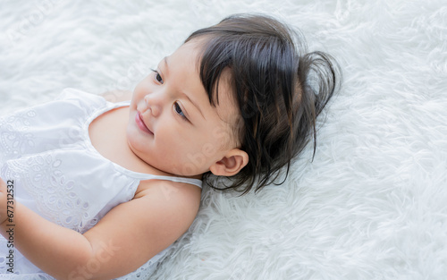 Portrait cute Caucasian little daughter girl smiling with happiness, lying down, taking nap at noon on comfortable bed in bedroom. Healthcare, Kid Concept