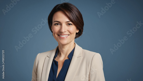 Portrait d’une femme d’affaires avenante en tailleur, sourire chaleureux, fond bleu moderne professionnel.