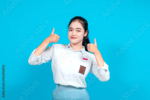 Portrait female student showing a 'OK' hand gesture, standing cheerful against a vibrant blue background, radiating positivity and assurance.