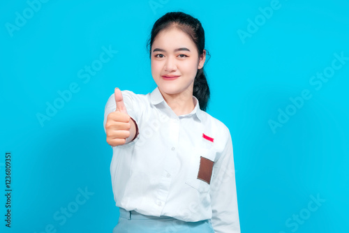 Portrait female student showing a 'OK' hand gesture, standing cheerful against a vibrant blue background, radiating positivity and assurance.