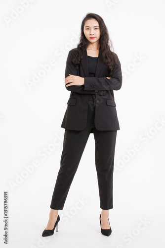 Portrait full body of asian beautiful woman curly long hair, wearing black suit, black long pants, model girl attractive confident charming, standing pose look at camera on white background in studio.