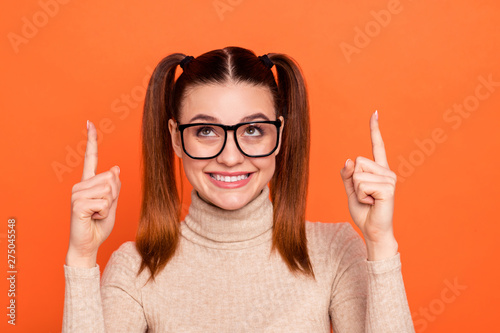 Portrait funny funky excited teen notice direct present ads choose decide news tip promo feedback indicate attention beautiful trendy eyewear eyeglasses stylish turtleneck isolated orange background