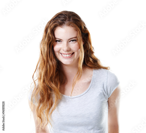 Portrait, girl and fashion with pride, hair care or positivity on white background. Female person, style and trendy on studio backdrop as happy or casual in outfit, clothes and confidence as student