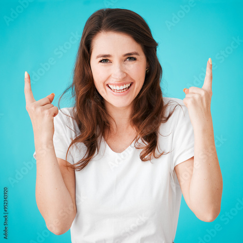 Portrait, happy woman and pointing up in studio for advertising, presentation or show info. Face, laugh and model with hand gesture for promo, discount deal or sales offer isolated on blue background