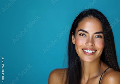 portrait headshot of 40 year old latina model with smooth long hair for skincare or hair care ad on blue background with space for text or logo