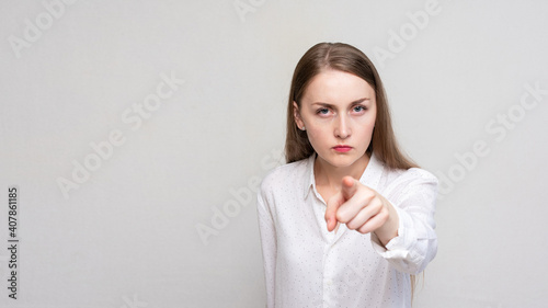 Portrait of a angry young woman pointing finger at you camera gesture, white background, 16:9
