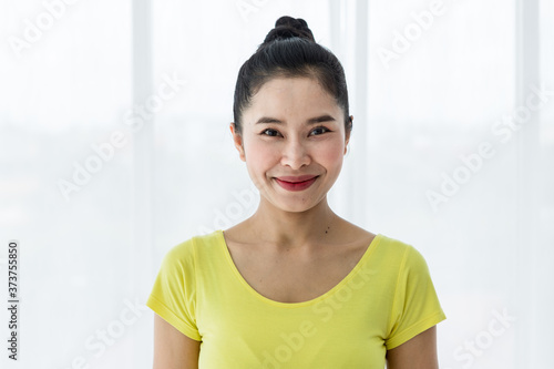 Portrait of a asian women workout practicing yoga in yellow dress and practice meditation wellness lifestyle and health fitness concept in a gym.