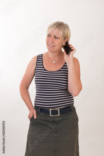 portrait of a attractive blond haired mid aged european woman wearing blue striped top acting with cellular phone - studio shot on white background.