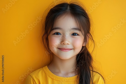 portrait of a beaming young asian girl her infectious smile lighting up her face set against a vibrant yellow background the image radiates happiness and innocence