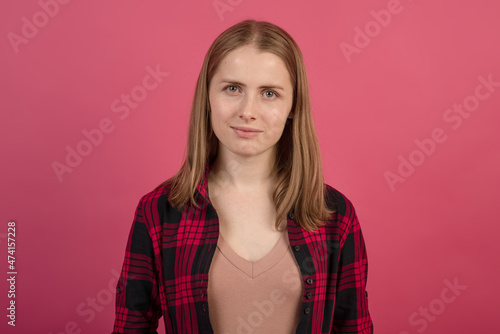 Portrait of a beautiful and attractive Caucasian blonde girl on a pink studio background.