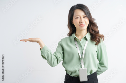 Portrait of a beautiful Asian businesswoman pointing to the side