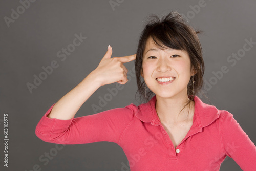 Portrait of a beautiful Asian teenager posing on a gray background with finger pointing at head