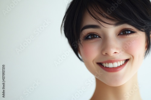 Portrait of a beautiful Asian woman with short hair, smiling against a white background.